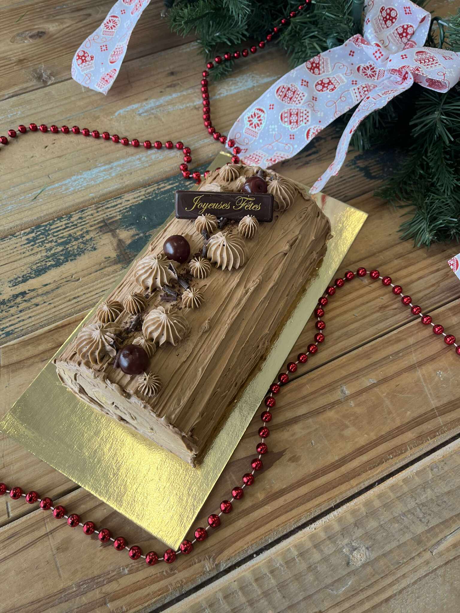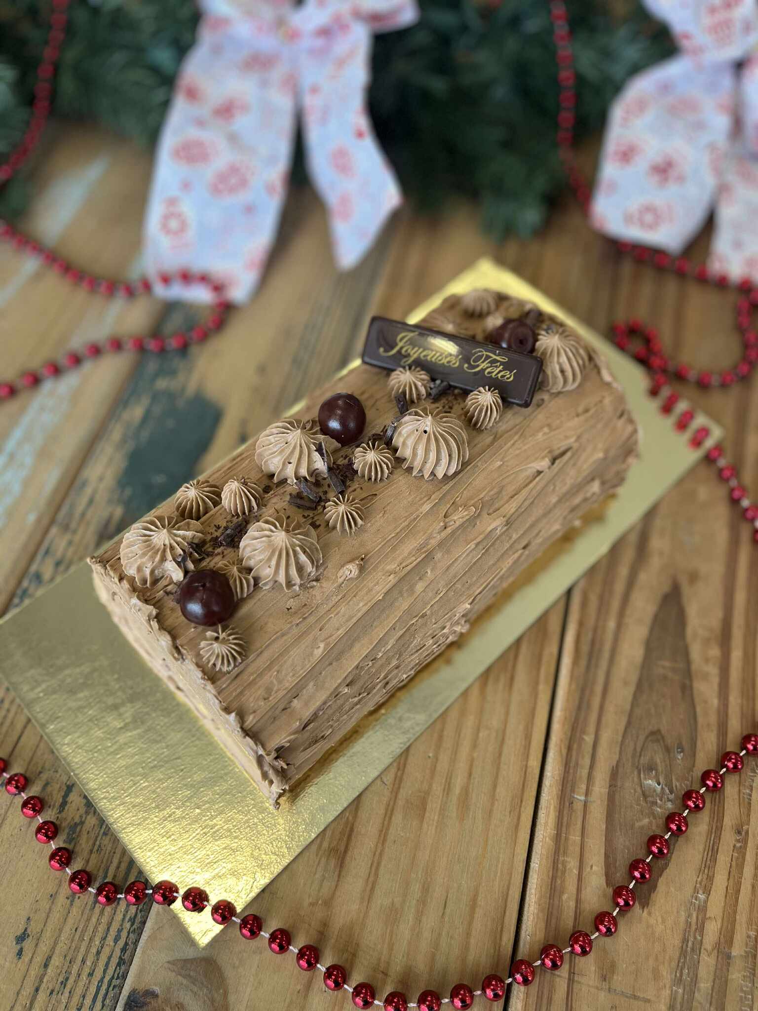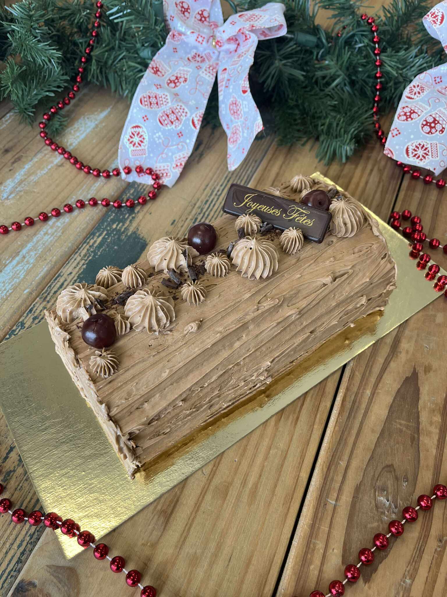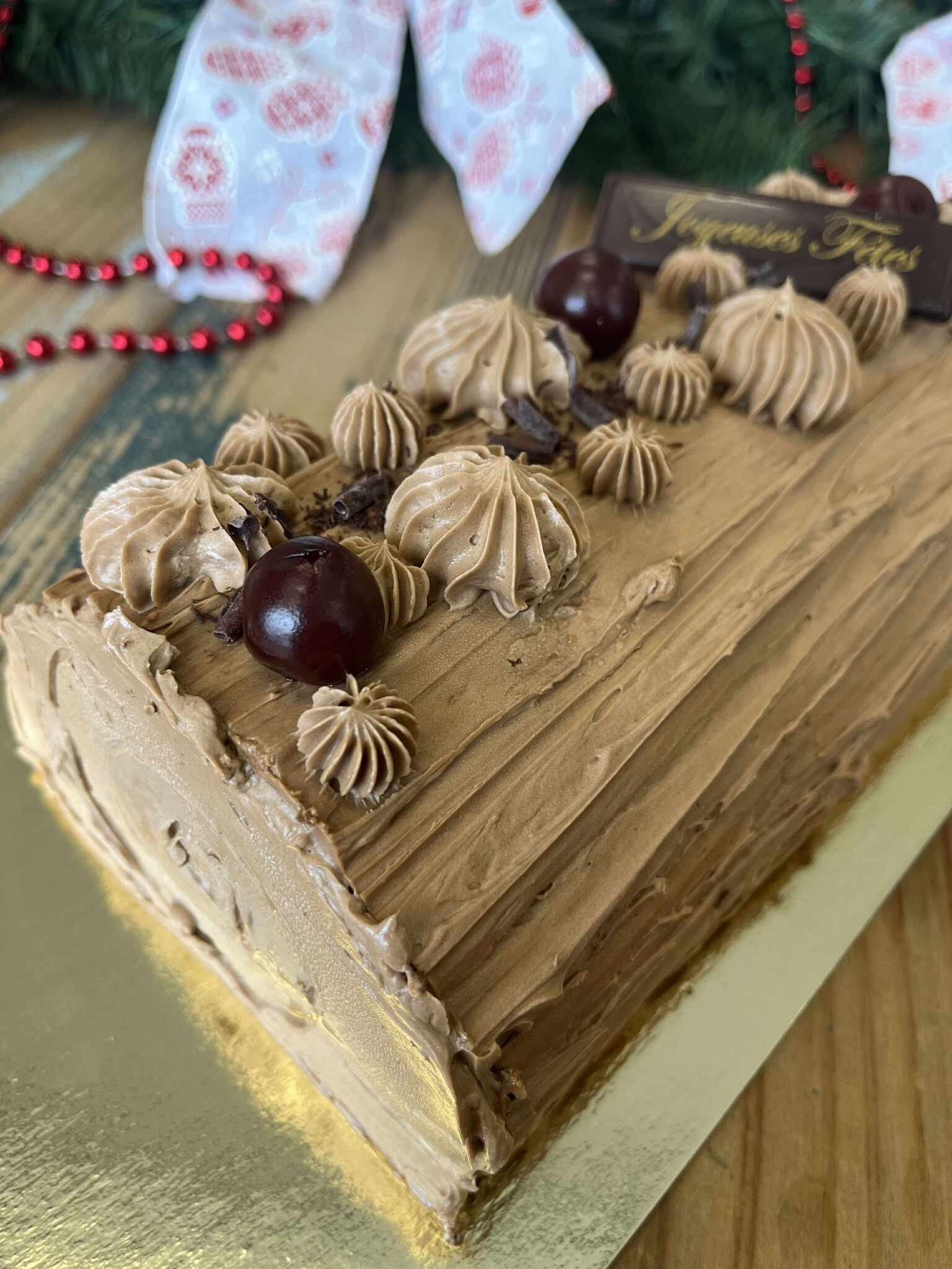 Pour les amateurs de bûches roulées, voici une de nos options cette année La bûche choco-Cerise!