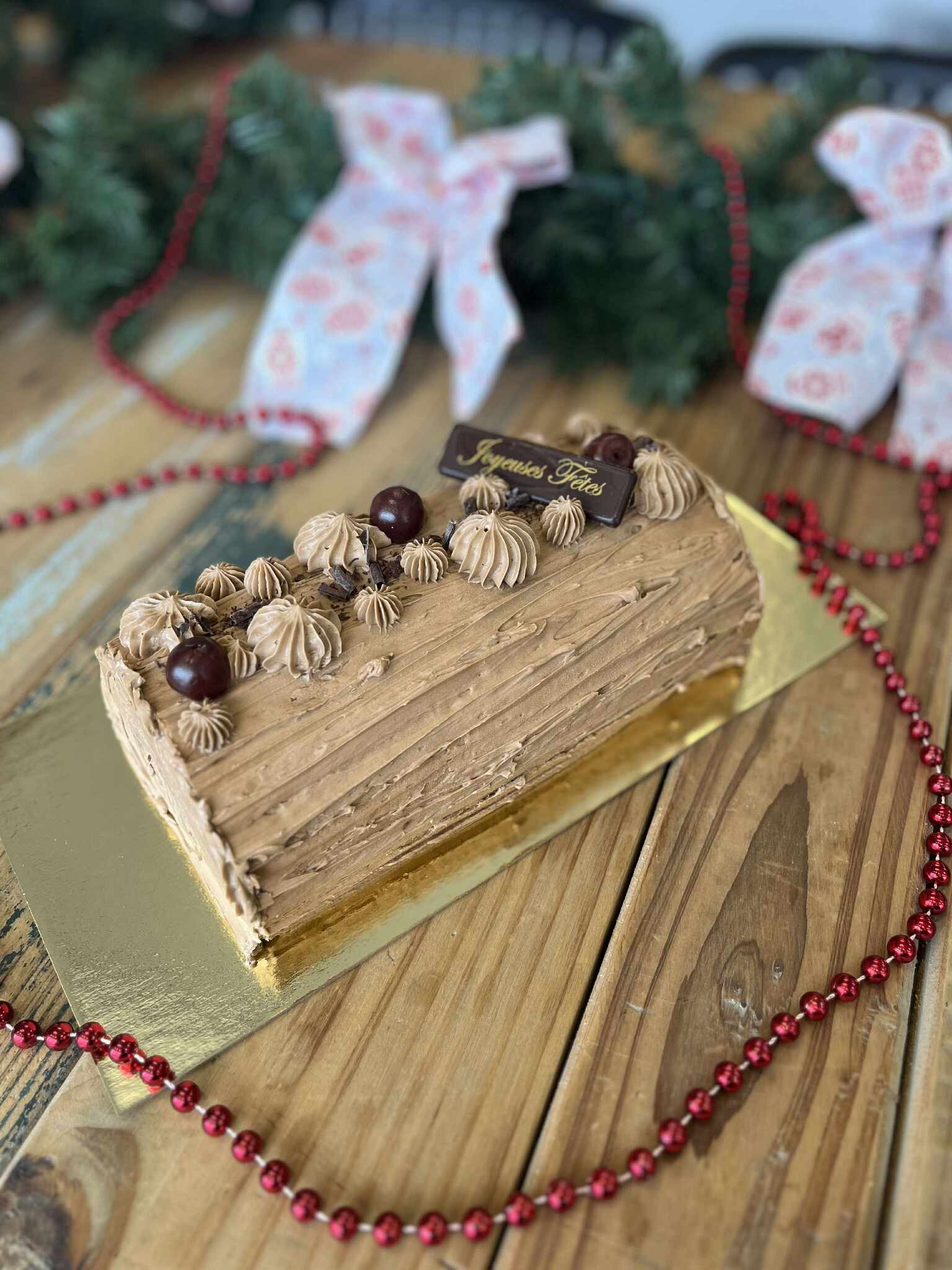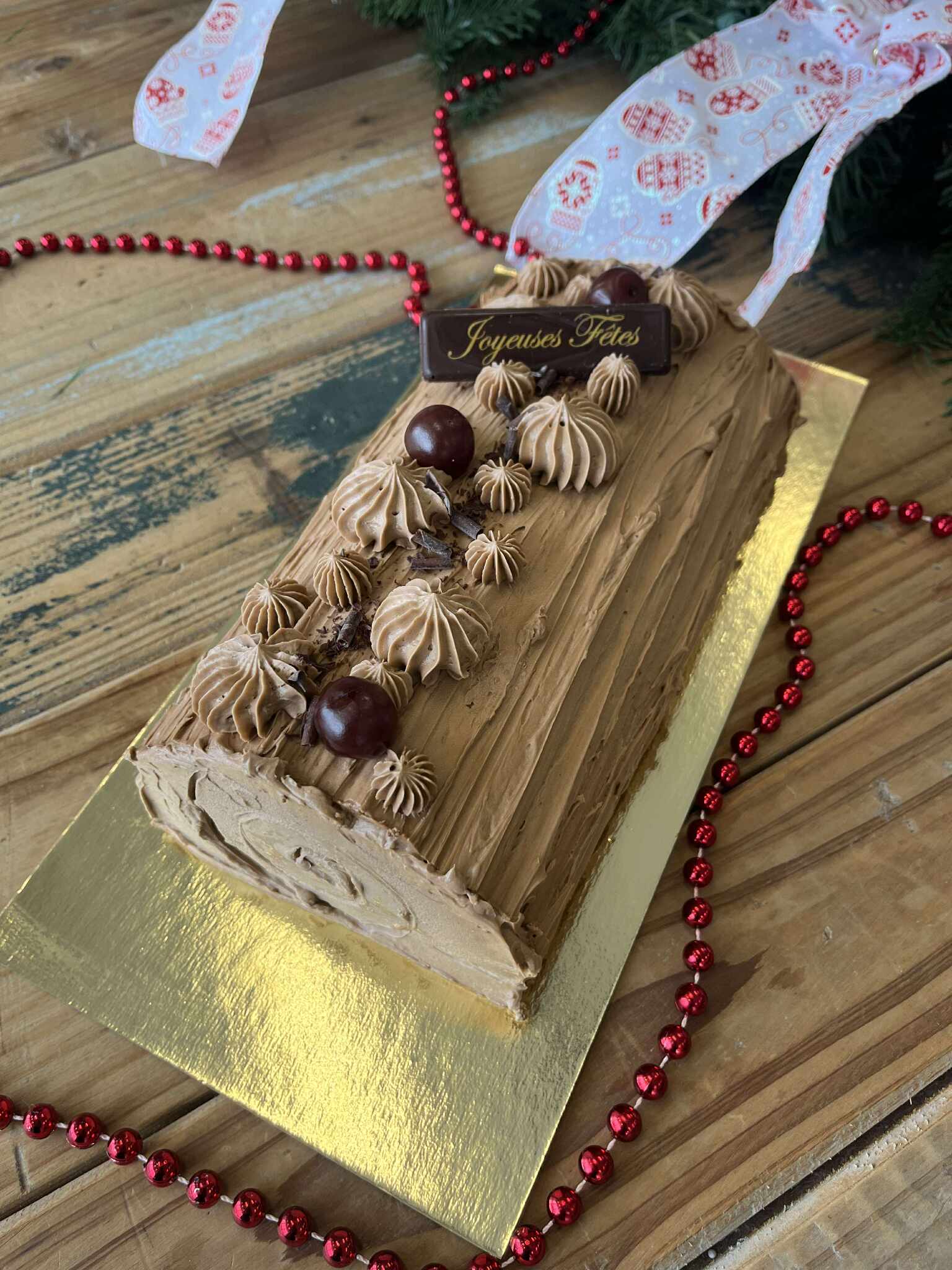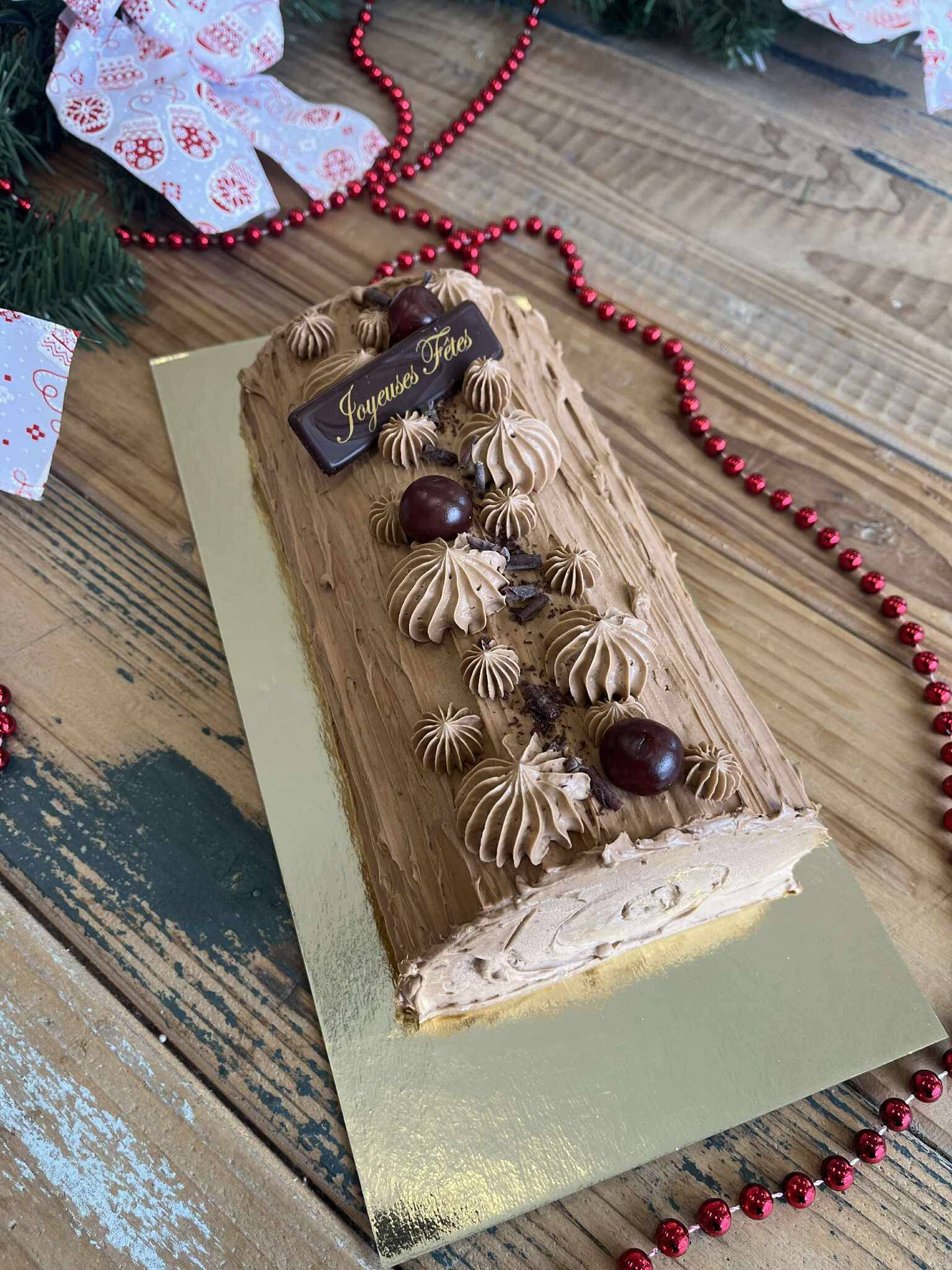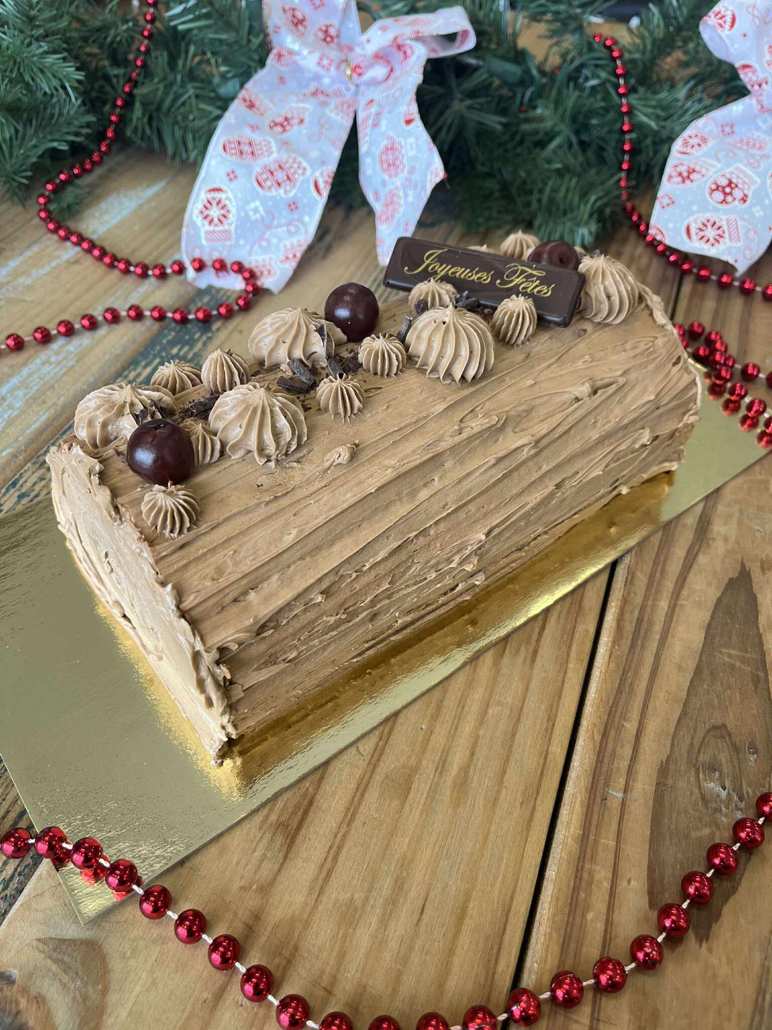 Pour les amateurs de bûches roulées, voici une de nos options cette année La bûche choco-Cerise!